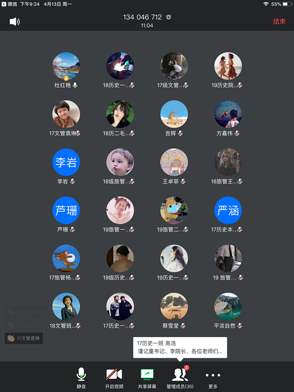 为了提升在线教学水平,保障在线教学质量,推动在线教学顺利开展,2020年4月12日晚20:00—21:00,bat365官网登录入口通过“腾讯会议APP”召开了2020-2021学年第一学期在线教学学情反馈云端会议。参加此次会议的人员主要包括:bat365官网登录入口17级、18级、19级历史学、文化产业管理、旅游管理、导游专业14个教学班的28名学生代表、bat365官网登录入口院长李岩教授、党总支书记童广运老师、主管教学副院长杜红艳副教授、教学秘书李密老师以及三位专职学生辅导员彭晓江老师、任柏阳老师和吉辉老师。会议由杜红艳副院长主持。