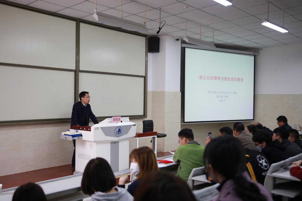 动员会后,学院特聘党史学习教育宣讲团专家成员,西安科技大学裴恒涛教授为参会的全体党员师生做了一场题为《遵义会议精神与理想信念建设》的专题报告。裴教授的报告紧密结合习近平总书记在党史学习教育动员大会上的重要讲话精神,以中国共产党在历史转折时期召开的一次重要会议——遵义会议为主线,从遵义会议的历史背景、遵义会议的召开及其转折意义、遵义会议精神的科学内涵、遵义会议精神与理想信念建设等四个方面展开做了精彩深入的阐述。裴恒涛教授谈到,当前我们党面临“四大考验”和“四大危险”,党员干部教师要通过党史学习教育和“四史”学习,进一步弘扬遵义会议精神,更加坚定理想信念,培育精神之钙,矢志拼搏奋斗,才能面向未来,走好新时代的长征路。