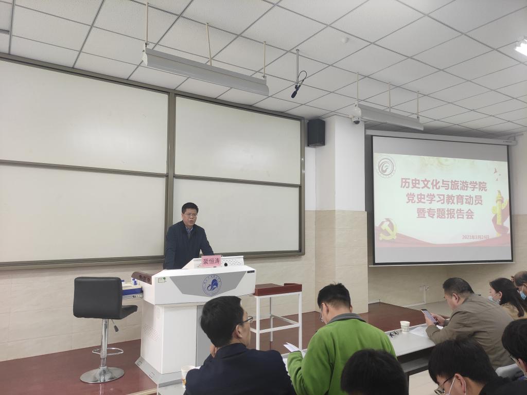 为深入学习贯彻习近平总书记在党史学习教育动员大会上的重要讲话精神,全面贯彻落实省委、省教育工委、校党委关于党史学习教育的部署和工作要求,推动党史学习教育走深走实,3月24日下午,bat365官网登录入口在四教阶一教室召开党史学习教育动员部署会暨专题报告会,对学院党史学习教育进行动员和部署安排。学院党总支书记童广运做动员讲话,教育部人文社科重点研究基地——中国共产党革命精神与文化资源研究中心副主任、西安科技大学马克思主义学院硕士生导师裴恒涛教授应邀做党史学习教育首场专题报告。学院党政班子成员、各党支部书记和全体教师以及学生党员、积极分子、团学干部等100余人参加会议。副院长(主持工作)杜红艳主持会议。