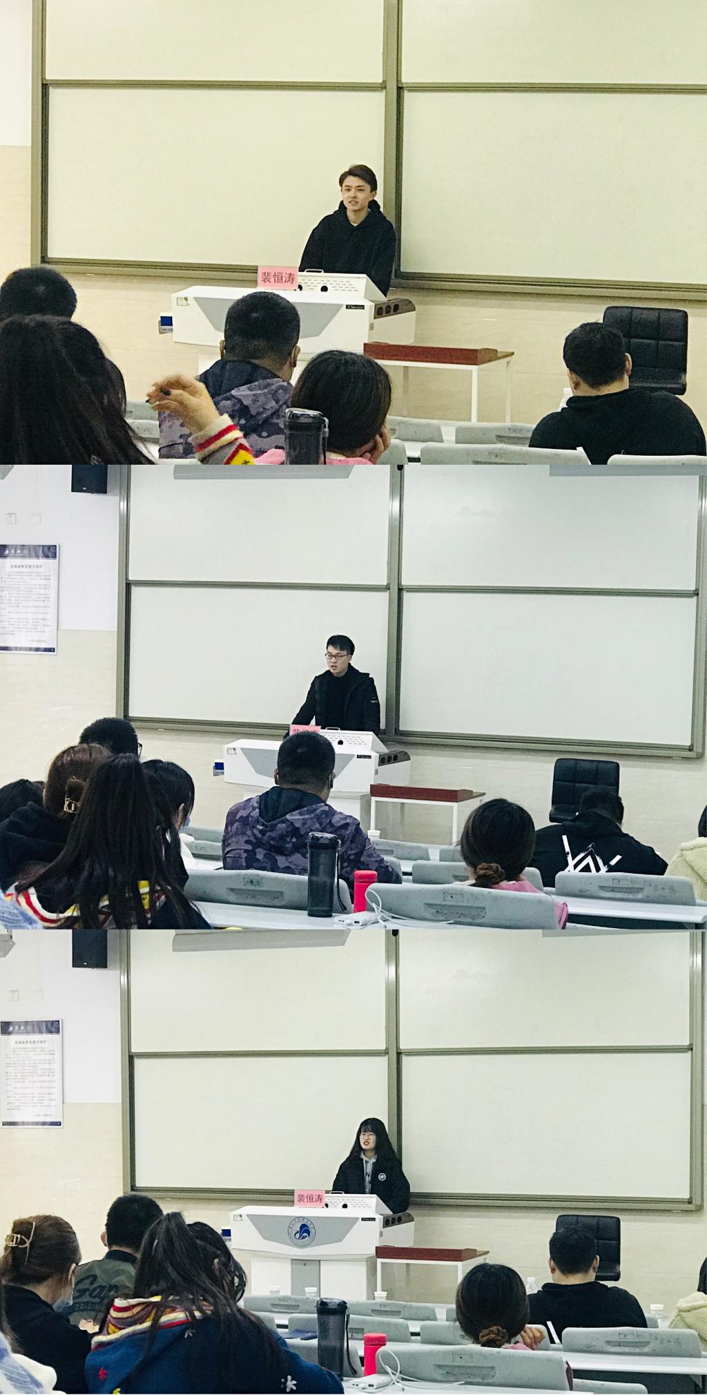 2017级参加考研的学生现身说法,用自身的考研经历,为2018级的同学分享经验。杨静远同学报考西安建筑科技大学马克思主义理论专业,总分415分,初试排名第一。严涵同学报考湖南师范大学世界史专业,总分392分,初试排名第一。此外于思源、高浩同学也从报考、应考、心理方面做了经验分享。