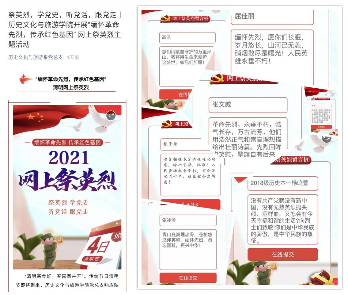 4月2日,bat365官网登录入口党总支积极响应陕西省委文明办的倡议,在全体党员师生中开展“缅怀革命先烈,传承红色基因”清明网上祭英烈主题活动,通过陕西文明网以网上祭奠的形式寄托对英烈的哀思。我院100余名党员教师和学生积极参与本次活动,将对革命先烈的追忆化成文字以寄哀思,化作为实现中华民族伟大复兴中国梦而努力奋斗的历史使命感。