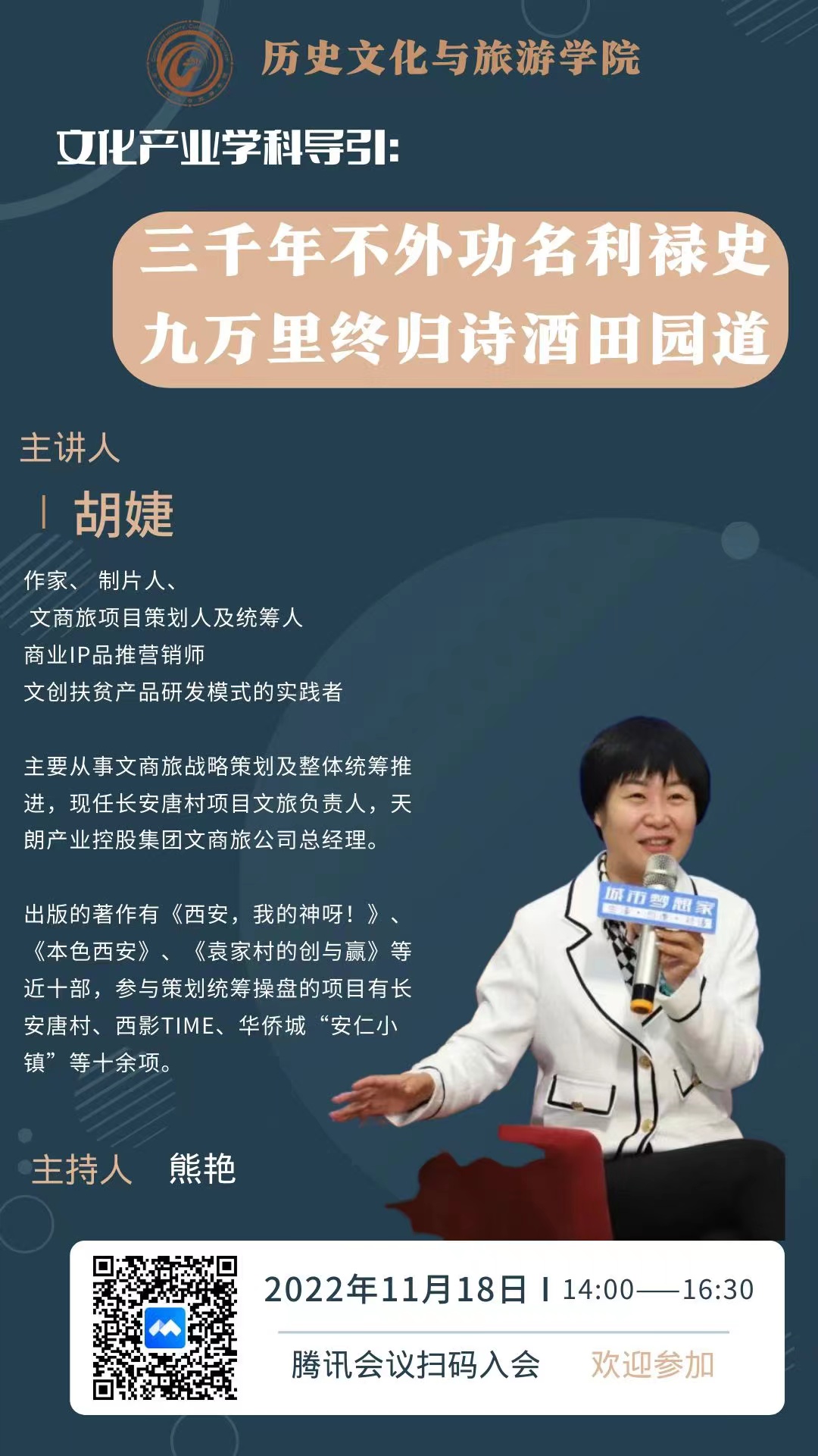 11月5日-11月18日,bat365官网登录入口分别邀请陕西文化产业投资控股(集团)有限公司张哲女士和天朗产业控股集团文商旅公司总经理胡婕女士,做了两场文化产业学科导引的专题课程。学院全体师生通过腾讯会议在线参加了本次课程报告,报告由熊艳老师主持。