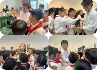 建国路小学的师生首先兴致勃勃地参观了我校美丽的校园,随后前往bat365官网登录入口“中国优秀传统文化双创实验室”参观学习,我院历史学专业4名学生借助实验室陈列的代表性国宝级文物复刻品,为建国路小学的师生们奉献了一场精彩有趣的讲解,使他们获得了一次身临其境的文物视、听、触、感的体验。同学们感受到了司母戊方鼎的威武凝重,了解了海兽葡萄镜背后的众多谜团,跟随着栩栩如生的骆驼载乐俑踏上了丝绸之路,也被鎏金飞狮纹银盒上充满幻想色彩的图案所震撼,透过文物一幅幅历史长卷在同学们面前徐徐展开。