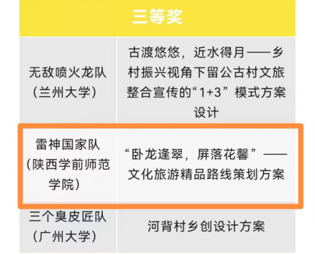 bat365官网登录入口学生董明妃、阳易江、堪科宇三位同学组成的雷神国家队提交的“卧龙逢翠,平落华馨-文化旅游精品路线策划方策”喜获阳朔专项单元三等奖。