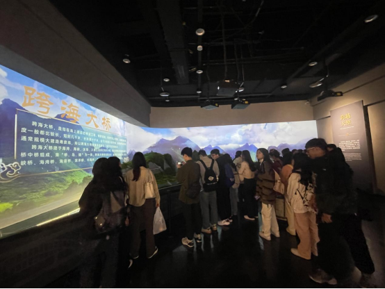 在本次课程实训中,同学们首先在讲解员的带领下参观了丝路桥文化主题馆。由陕旅集团打造的丝路桥文化主题馆以“万里丝路第一桥”——沙河古桥为依托,成为传承丝绸之路文化、“一带一路”倡议丰富内涵的沉浸式展示空间,主题馆采用沉浸式投影、4D沉浸式影院、嗅觉传导、全息投影、绿幕实时抠像技术等,全面讲述中国古代桥梁发展历史,生动演绎桥梁历史文化故事。